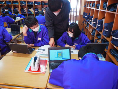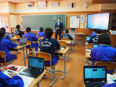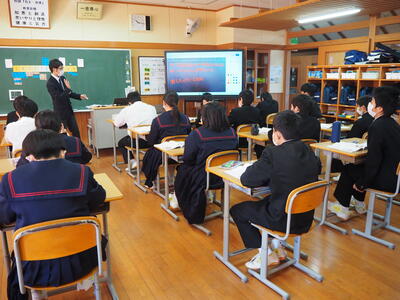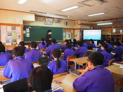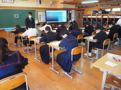 本日、初任者研修の授業研修会が本校であり、県南の各中学校の新任の先生方が集まりました。その研修会の中で、2年1組の「英語」と2年3組の「国語」の授業が公開されました。