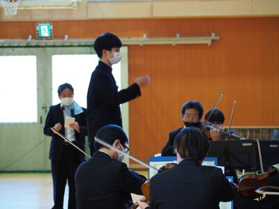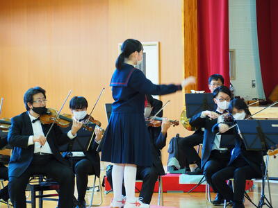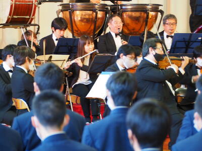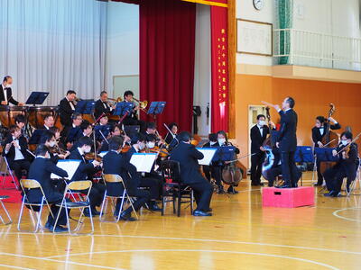 2022年11月14日 15時29分本日、中高一貫教育事業の芸術鑑賞教室が、本校体育館にて、塙工業高校の皆さんにおいでいただき開催されました。今年度は、音楽鑑賞で「東京スカイライン・オーケストラ」による公演でした。生徒の代表が指揮者を体験する場面、穂積佑希乃先生がオーケストラの一員になりフルートを演奏する場面などもありました。