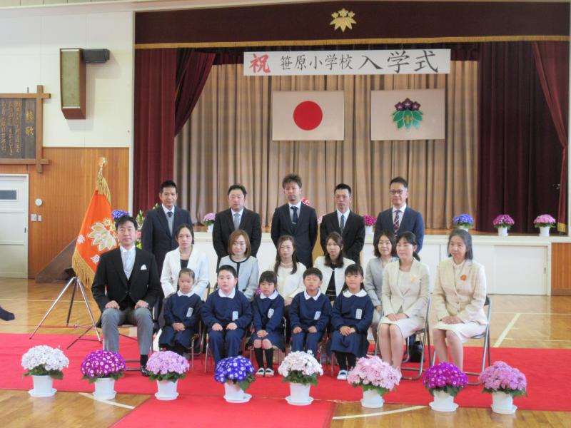 気持ちがよい青空が広がりました。新年度が始まって2日目、全校生が登校しました。そこで、教職員、ささはらっ子全員で、写真を撮りました。前列の1年生も2年生から6年生のみんなも素敵な笑顔でした。
