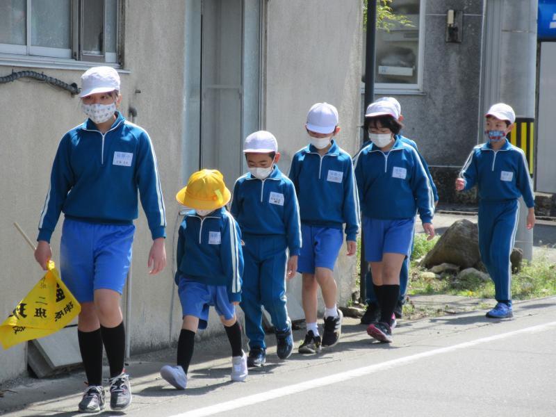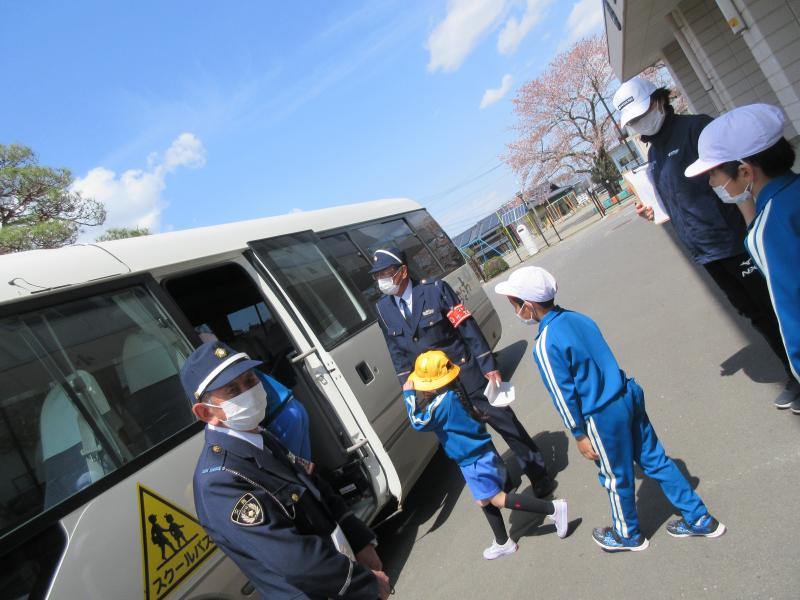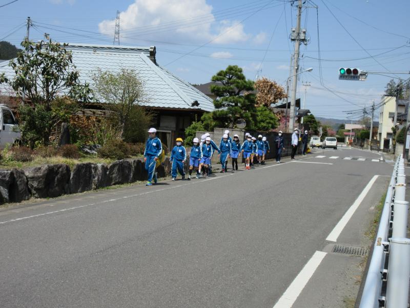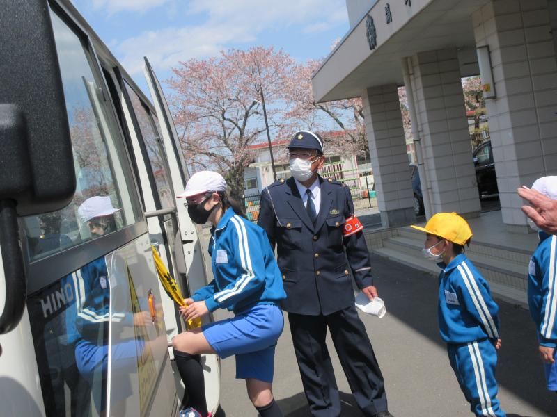 第1回交通安全教室を行いました。ねらいは、①正しい道路の歩き方が分かり、安全な歩行ができるようにする。②バスの乗り降りの仕方、下車後の道路歩行の仕方などが正しくできるようにする。です。最初に笹原駐在所員の方から、交通安全推進委員委嘱状の交付と講話をいただきました。その後、交通安全指導委員の方々にもお話をいただき、通学班ごとに実地訓練を行い、横断歩道の渡り方、正しい歩行の仕方などを確認しました。また、バスの安全な乗降の仕方も確認しました。