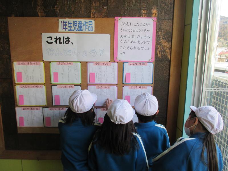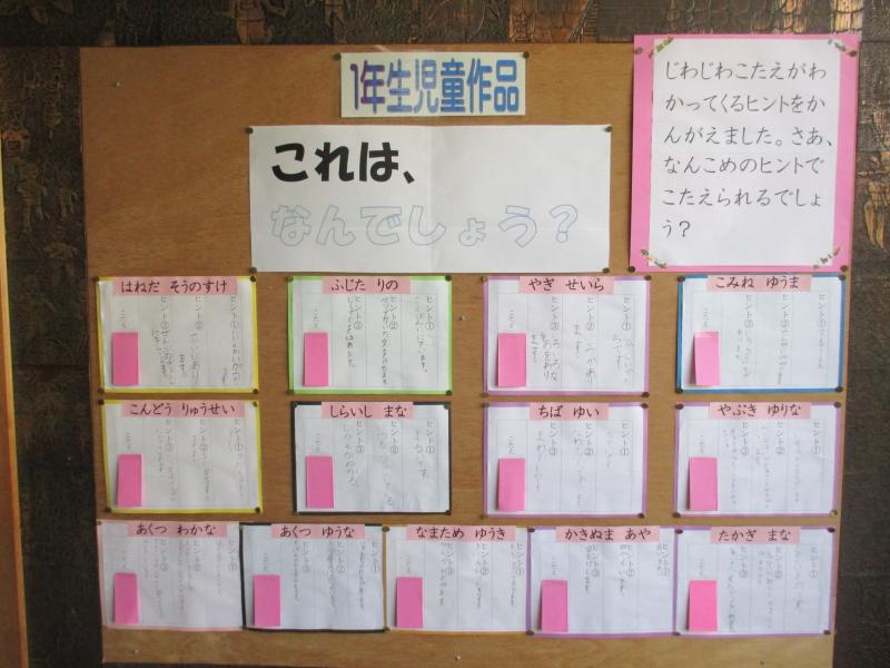 階段前の掲示板には、1年生の「これは、何でしょう?」が掲示されています。休み時間になると、掲示板の前には、子どもたちの輪ができています。26日(金)は授業参観です。保護者の皆様、来校の際には、1年生が考えた問題にぜひ挑戦してみてください。