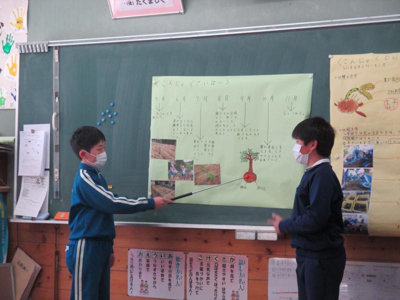 今日、5年生が「こんにゃく栽培学習」でご指導いただいた生田目嘉穫さんと生田目一恵さんをお招きし、1年間学習してきた「こんにゃく栽培体験」についての発表会を行いました。塙町の特産品でもあったこんにゃくについて分かったことや感じたこと、こんにゃく料理のこと等を各グループで発表しました。普段何気なく食べているこんにゃくですが、長い年月と手間ひまかけて作られていることを改めて確認しました。生田目さんから今日の発表内容について、たくさんお褒めの言葉をいただきました。5年生、がんばりました!