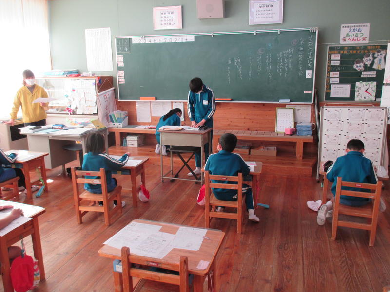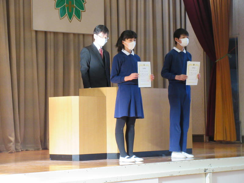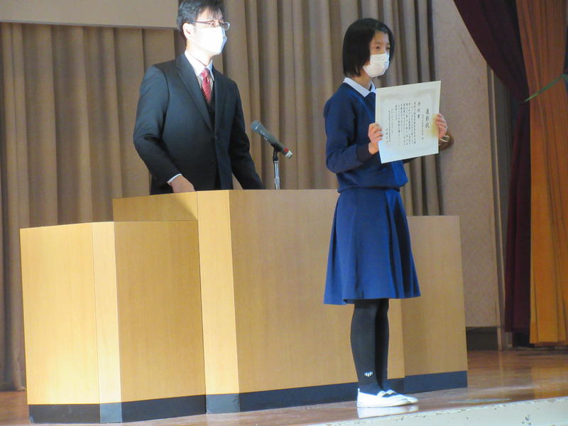 式終了後、賞状伝達を行いました。学期末に行った「漢字・算数オリンピック in sasahara」の合格証を6年生の加奈美さん(漢字)と太智さん(算数)が代表で授与されました。多数児童が合格しました。次に「ふくしまを17字で奏でよう絆ふれあい支援事業」の学校賞を、6年生の莉子さん代表として受け取りました。