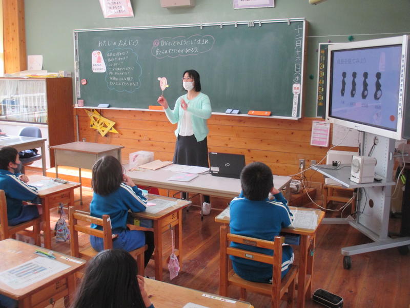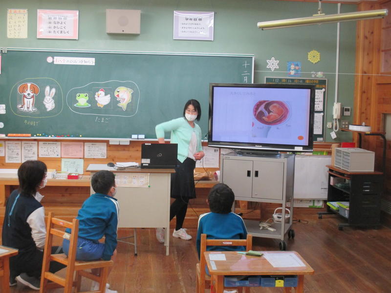 今日は、2年生が『おへそのひみつ』、3年生が『わたしの誕生』という学習(性教育)をしました。助産師の金田さんが来校し、専門的なお話をしてくださいました。両学年とも、生命の大切さを感じるとともに、家族の愛情によって大切に育てられていることに気づくことができました。