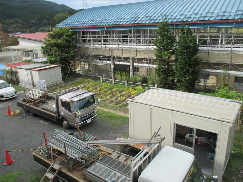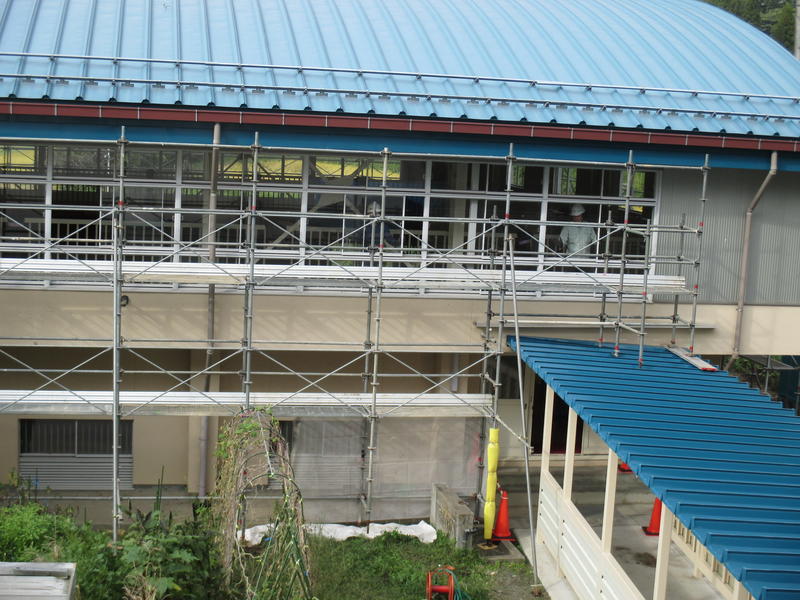 体育館の窓枠改修の工事が始まりました。しばらくの間、足場が組まれた状態になりますので、ご注意ください。体育館の使用については問題ありません。