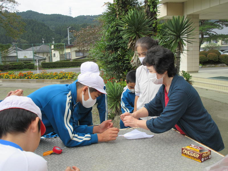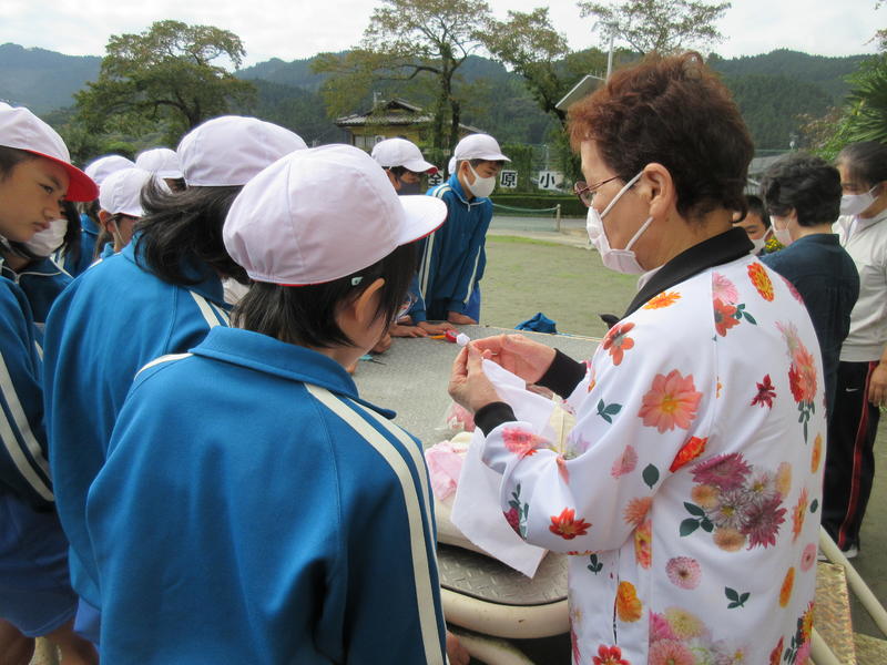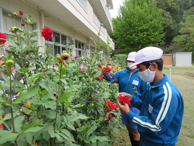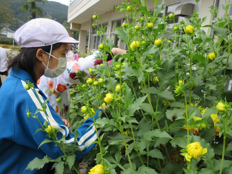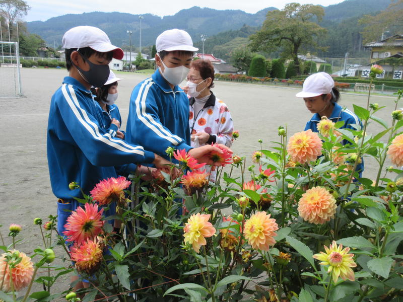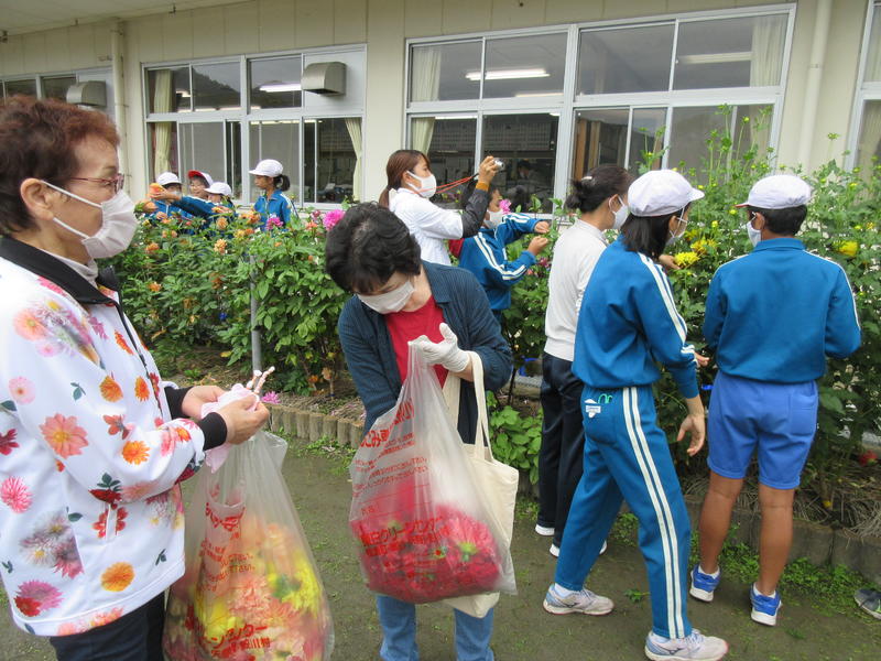 大切に育ててきたダリアの花で、これから染め出しの体験をする予定です。そのために、6年生が今もきれいに咲いているダリアの花摘みをしました。地域の方を外部講師としてお招きし、染め出しに適した花の大きさや色について説明を受け、ビニール袋いっぱいに摘み取りました。これらを染料にしていただき、後日、染め出しの体験をしていきます。自分ちが大切に育ててきたダリアでどんな染め出しができるか、今からとても楽しみです。