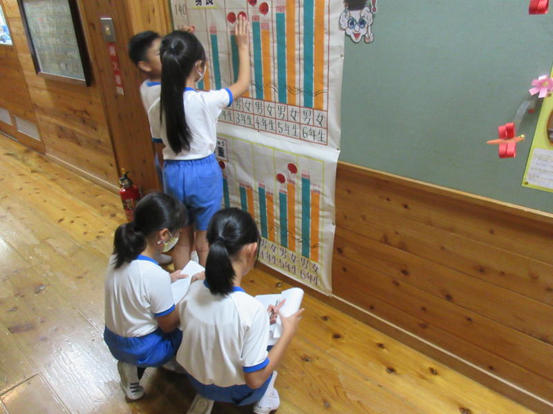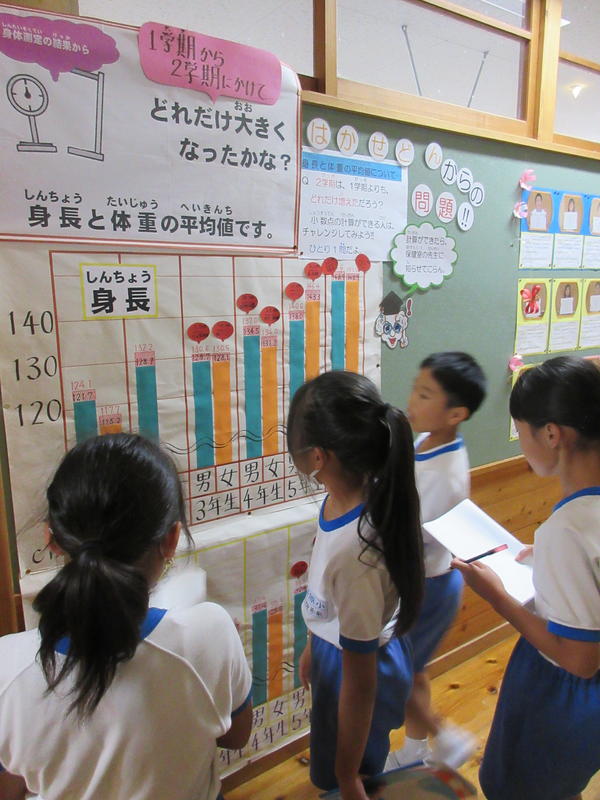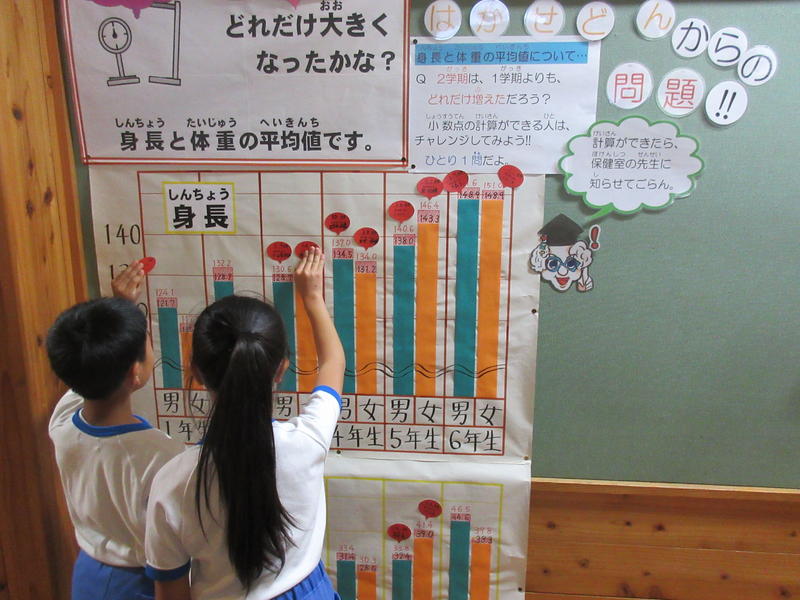 保健室前の掲示板に、『はかせどんからの問題』が提示してあります。その問題とは、「1学期から2学期にかけてどれだけ大きくなったかな?」という問いで、各学年の身長と体重の変化が分かる棒グラフから、その答えを導き出すというものです。一人一問と制限がありますが、小数を学習した学年のお友達は、競ってチャレンジしています。