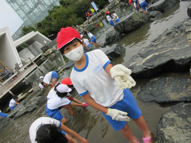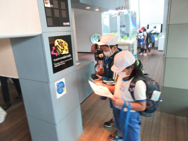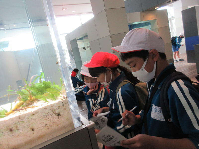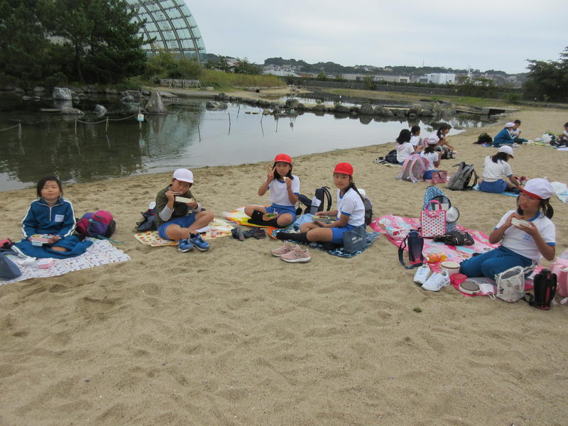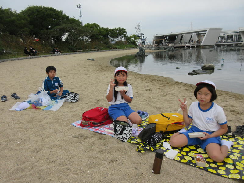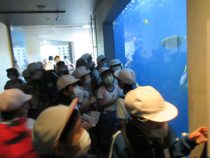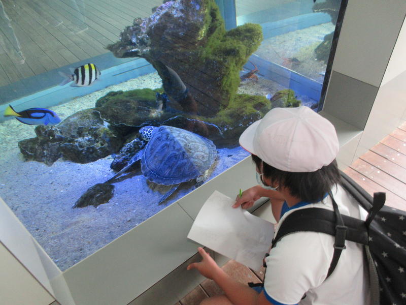 アクアマリンふくしまに行ってきました。まずは「蛇の目ビーチ」で、生き物探しをしました。ヒトデやなまこ、ヤドカリ等次々に見つけ、コレクションのように並べる子もいました。そして、お弁当やおやつを食べている間には、水の中からカメが顔を出したり、魚が飛び跳ねたりして、楽しいお昼の時間になりました。午後は、「エッグいきものクイズ」に取り組んだり、館内を見て回ったりしました。興味津々な様子で観察し、たくさんの驚きと発見がありました。