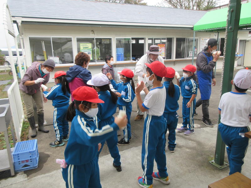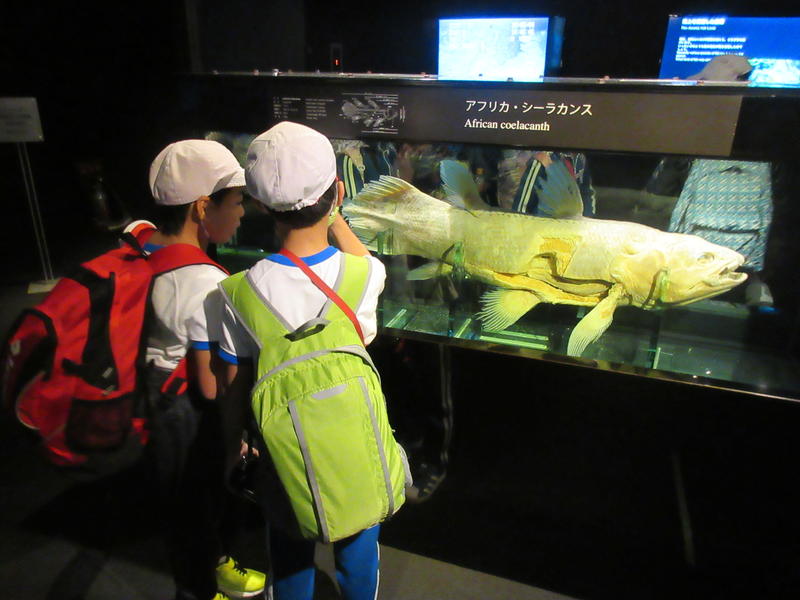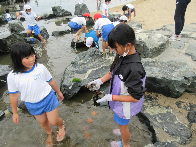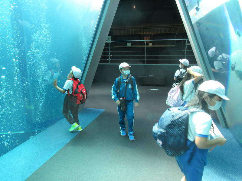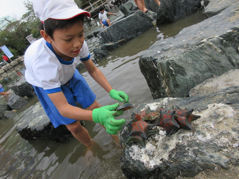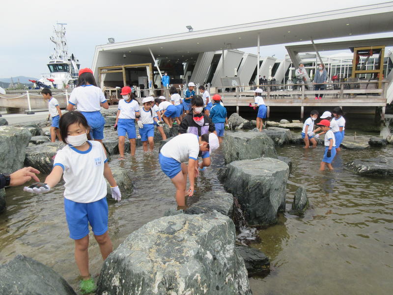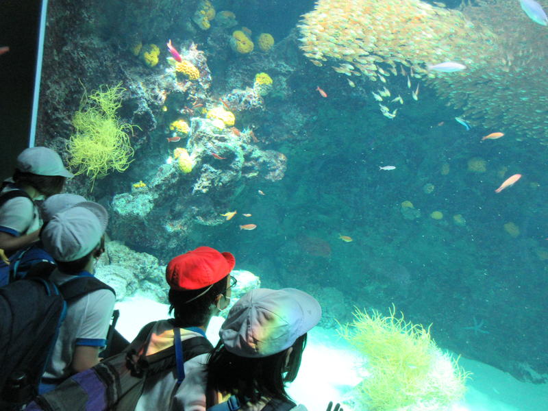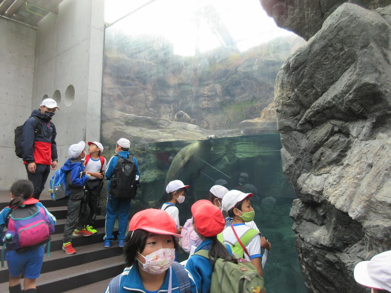 アクアマリンふくしまに行ってきました。まずは「蛇の目ビーチ」で、生き物探しをしました。ヒトデやなまこ、ヤドカリ等次々に見つけ、コレクションのように並べる子もいました。そして、お弁当やおやつを食べている間には、水の中からカメが顔を出したり、魚が飛び跳ねたりして、楽しいお昼の時間になりました。午後は、「エッグいきものクイズ」に取り組んだり、館内を見て回ったりしました。興味津々な様子で観察し、たくさんの驚きと発見がありました。