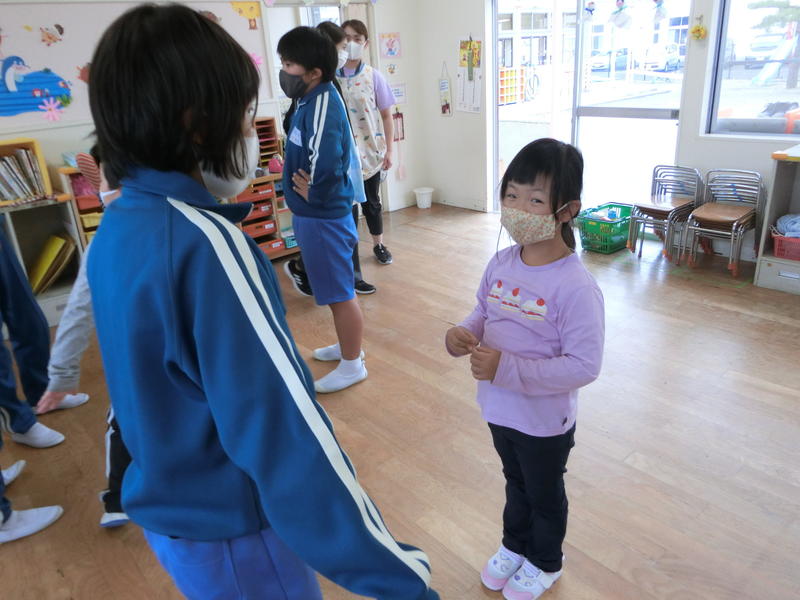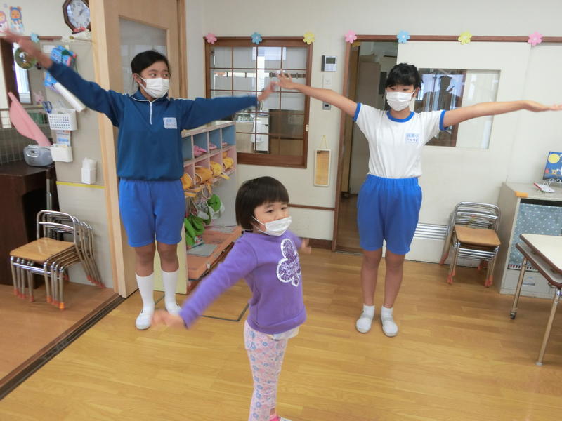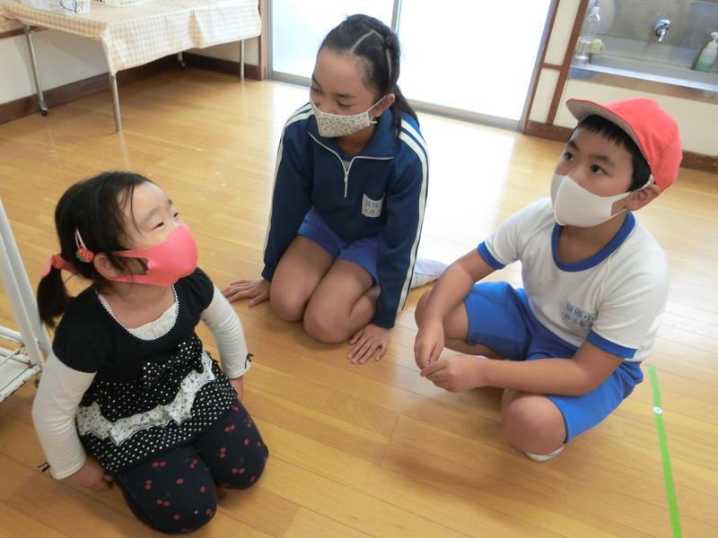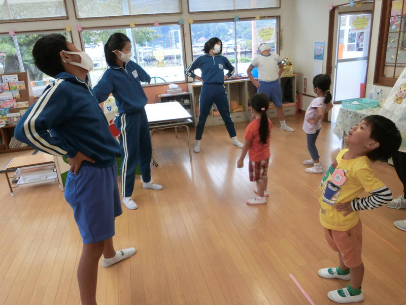 お昼休みに6年生と笹原幼稚園の子どもたちが交流しました。運動会に向けて『ラジオ体操』のやり方を、6年生が幼稚園児に優しく教えました。始めのうちは緊張した雰囲気もありましたが、おしゃべりなどしながら時間とともに和やかな雰囲気になり、笑顔で取り組むことができました。6年生にとっても幼稚園児にとっても、とてもよい時間になりました。幼稚園児の体操もとても上手になりました。