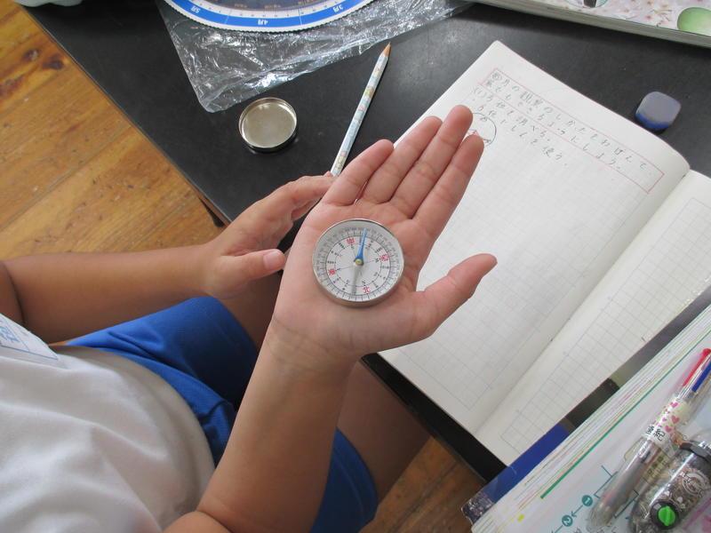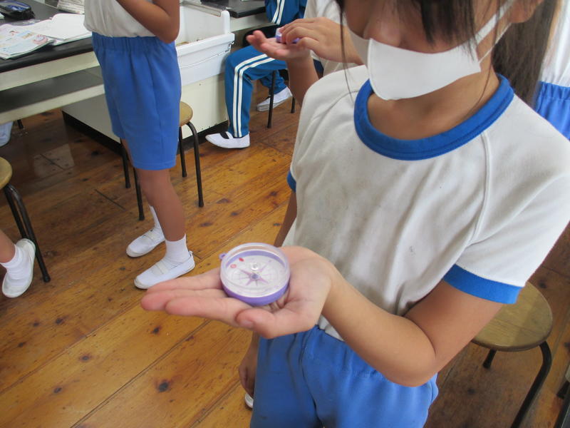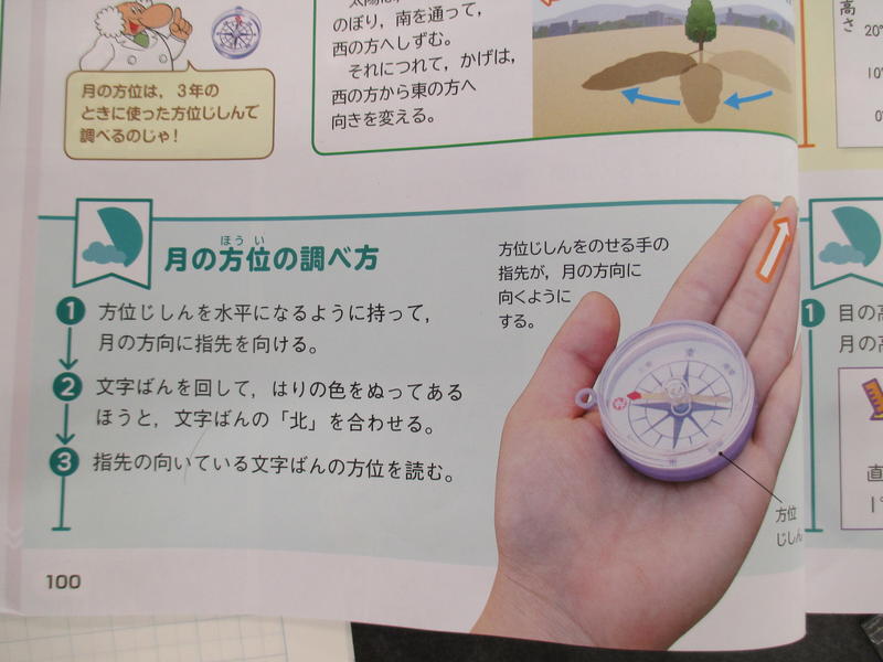 10月1日は中秋の名月。最も月がきれいに見えるこの時期に、4年生は月の観察をします。現在、理科『月の位置の変化』の学習をしています。今日は、月を観察するために必要な「方位磁針」の使い方を学習しました。