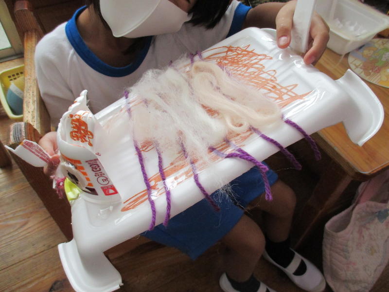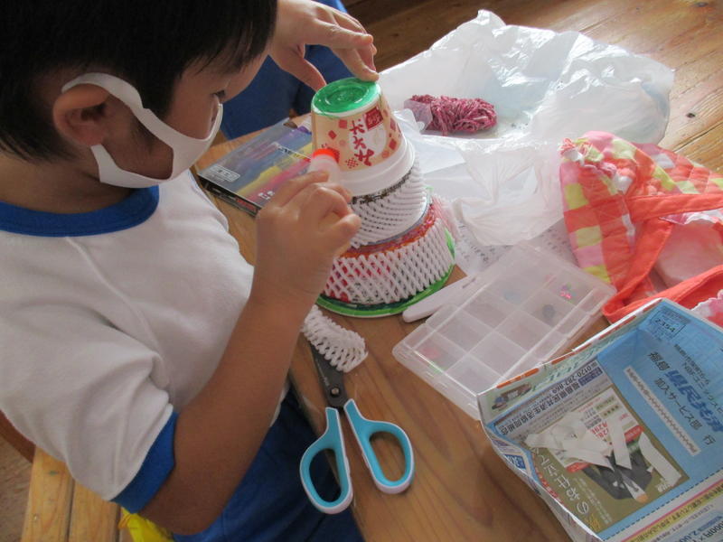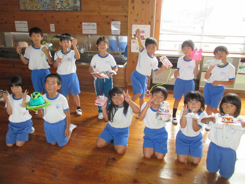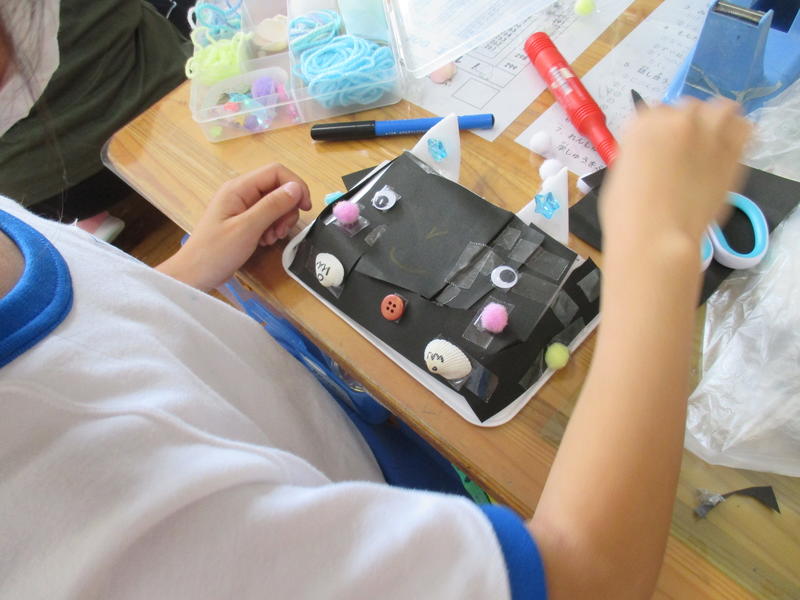1年生が、図画工作科『ふわふわゴー』の学習をしました。プラスチック容器やトレイを土台にし、はさみを器用に使って形を変えたり、組み立てたり・・・。それに身近にある材料で飾りを付けるなどして、思い思いの作品作りを楽しみました。