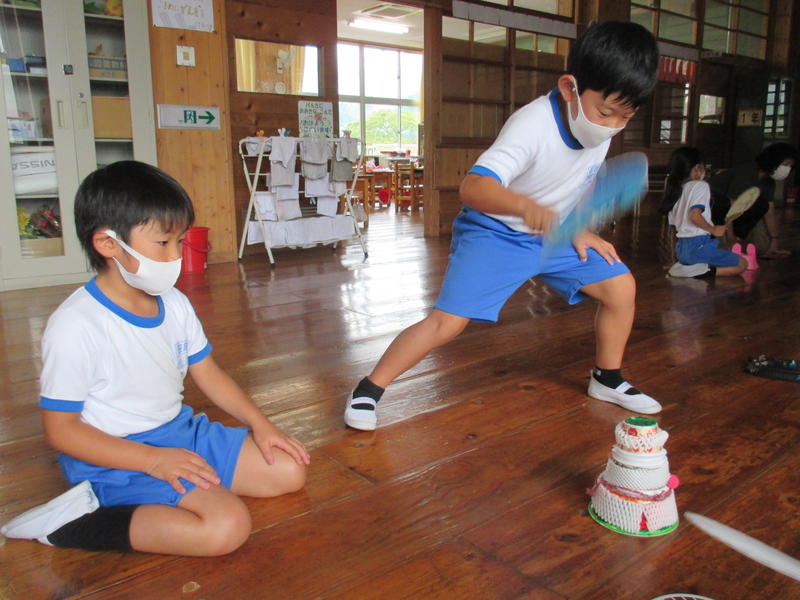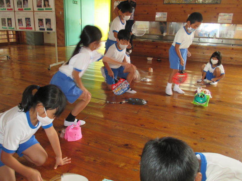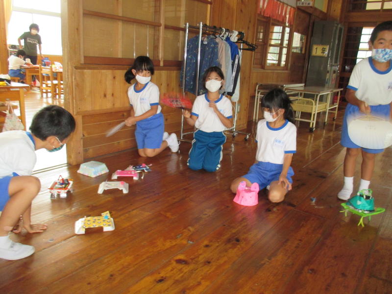 次に、できあがった作品をうちわの風を利用して、動かしました。左に行ったり右に行ったり、ひっくり返ったり・・・、ユニークな動きをする作品に歓声が上がりました。