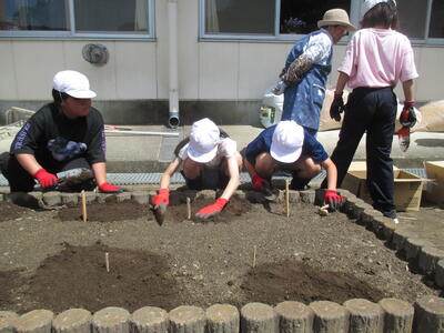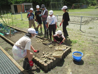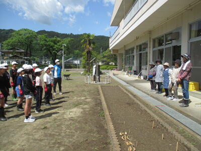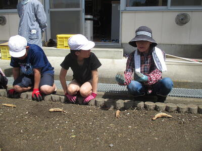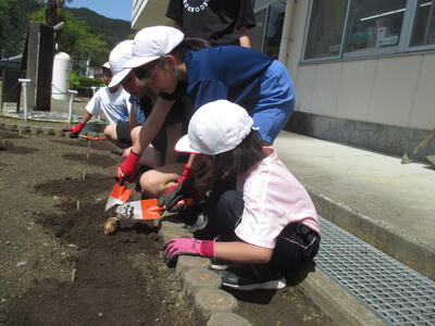 ダリアの球根植え 2024年5月17日 11時47分 今年度も5・6年生がダリアを育てていきます。今日は、福寿会の方々とともに球根を植えました。芽と根の部分を確かめながら、丁寧に植えていきました。今年度もきれいな花を咲かせていきたいと思います。