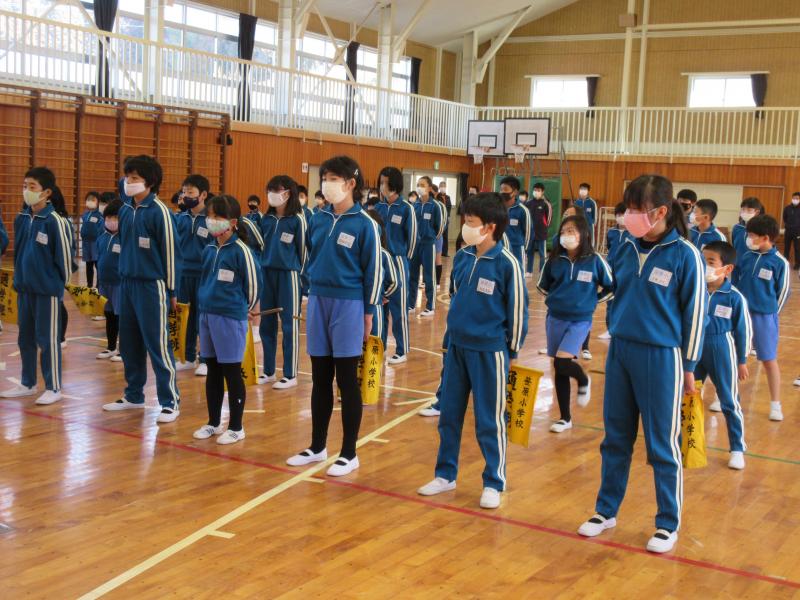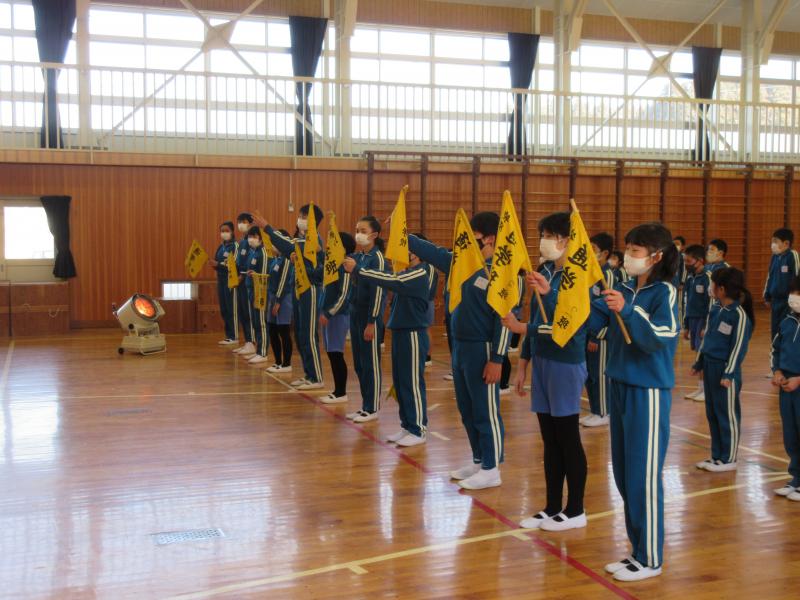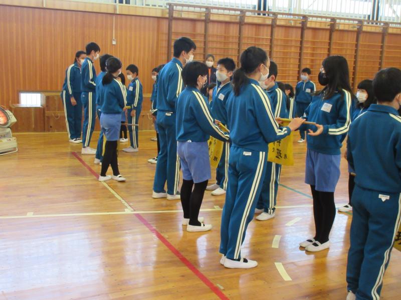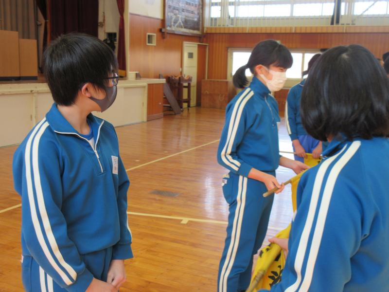 通学班引継ぎ式を行いました。6年生班長から新班長へ班旗が渡されました。24日(水)から新班長のもとで登校します。旧班長は、班を見守ります。今年度も残りわずかです。今まで6年生が中心となって取り組んできたことが、引き継がれていきます。
