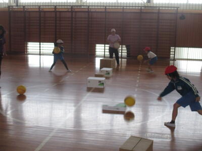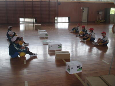 今日は、箱にボールをぶつけるゲーム(1年生対2年生)を行いました。