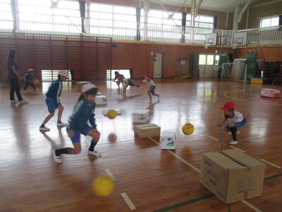 ゲームが始まると、箱めがけてボールを勢いよく投げ、箱を動かしていきました。大きな箱は、なかなか動かないので、何度もぶつけて動かしていきました。ボールの投げ方に力強さを感じました。