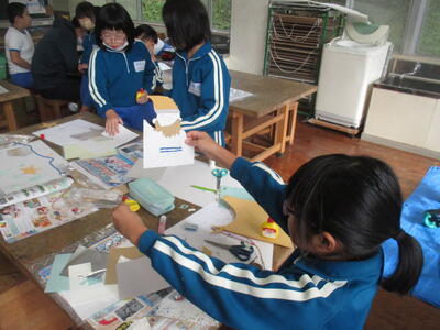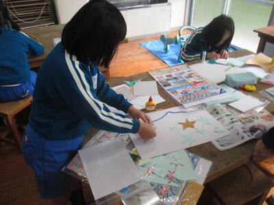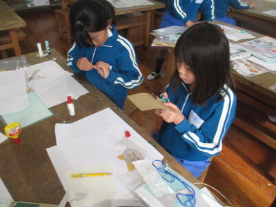 3年生は、紙版画。ボール紙や毛糸などの素材を生かし、下絵に沿って貼っていきます。