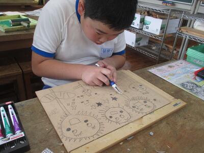 3・4年生の図工では版画の学習で取り組み、これまで下絵を描いてきました。