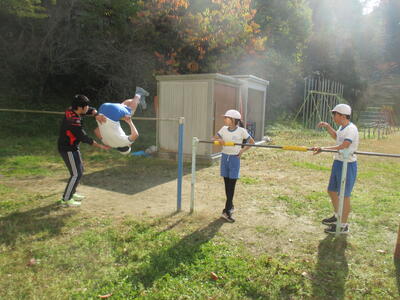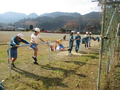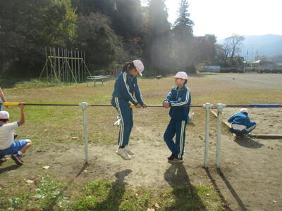 5・6年生の体育で鉄棒の学習をしています。