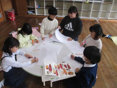 そこで、幼稚園児に、「さつまいもの育ち方、さつまいもの料理の仕方を教えよう」ということで、みんなで発表するために資料作りに取り組みました。
