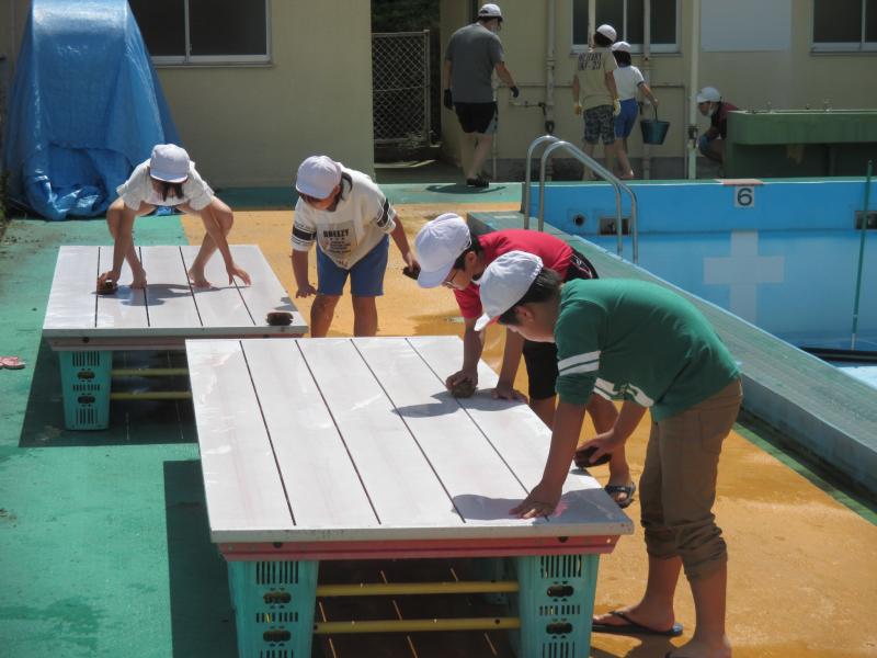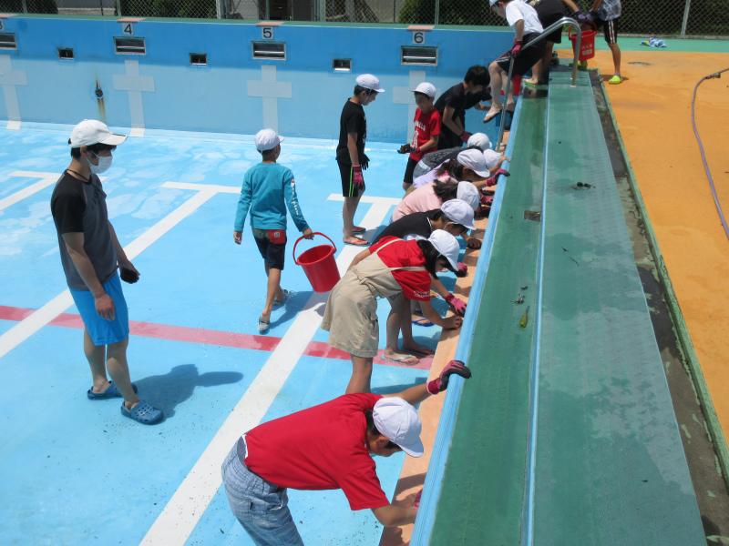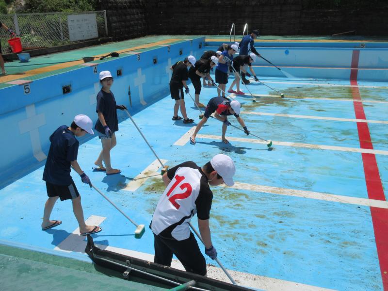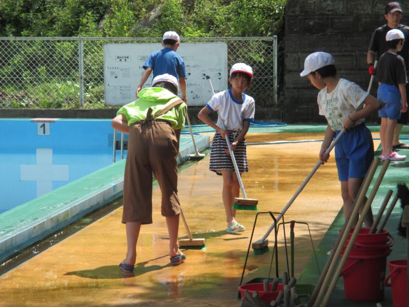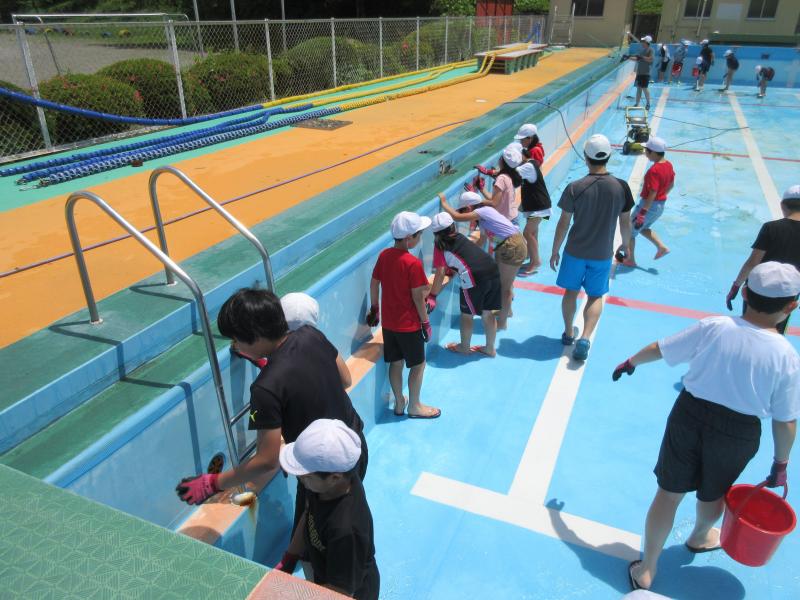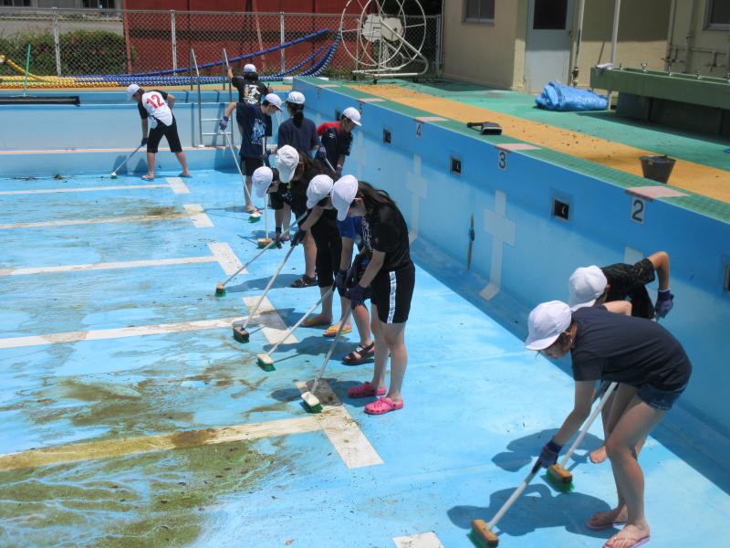 全児童でプール清掃をしました。下学年がプール周りの除草など、4年生がプールサイドとプール台清掃、高学年がプール底、壁の汚れを落としました。みんなの力でとてもきれいなプールになりました。これから、徐々に入水していきます。夏の水泳学習が楽しみですね。