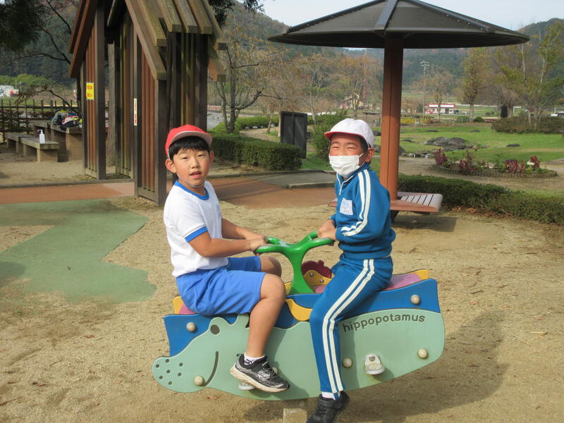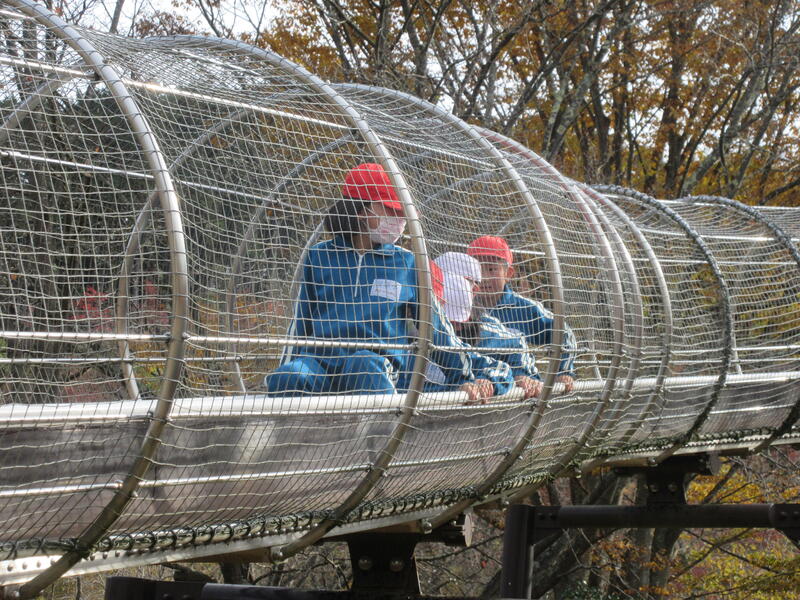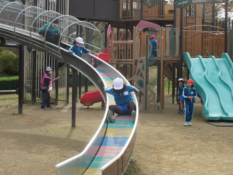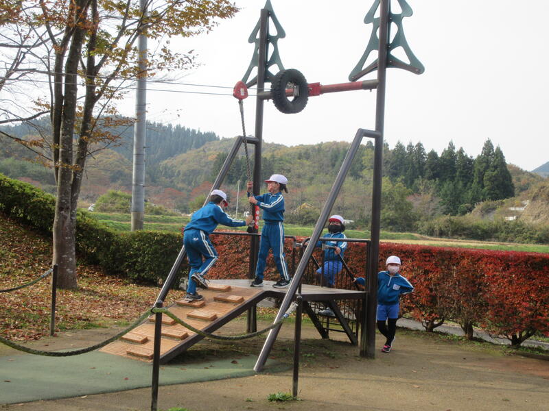 1・2年生の生活科の学習で白河市の関の森公園に行ってきました。この学習のねらいは、①異学年との交流を通し、季節の変化に気づいたり身近な自然を観察したり楽しく遊んだりすることができる。②公共物や公共施設、乗り物など、みんなで使う物を大切にし、安全に気をつけて正しく利用することができる。です。秋晴れの中、子どもたちは、このねらいのもと、楽しい時間を過ごしました。特に、学校にはない長いすべり台やロープのジャングルジムが人気でした。