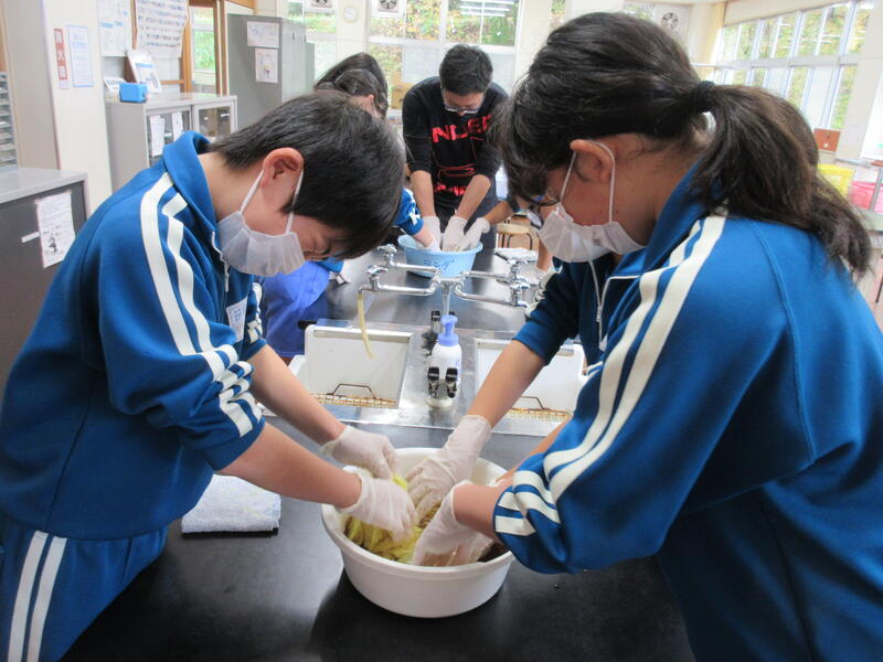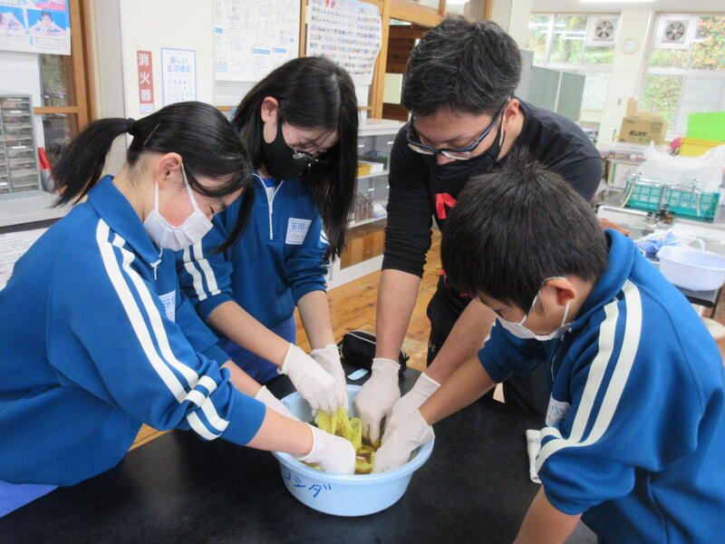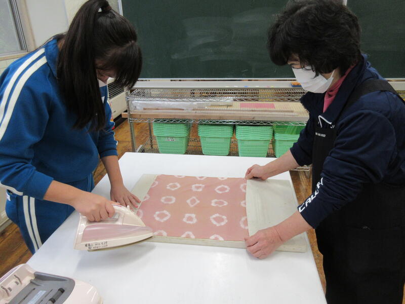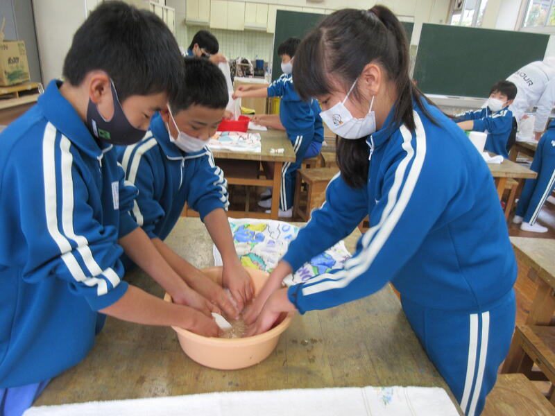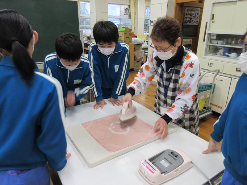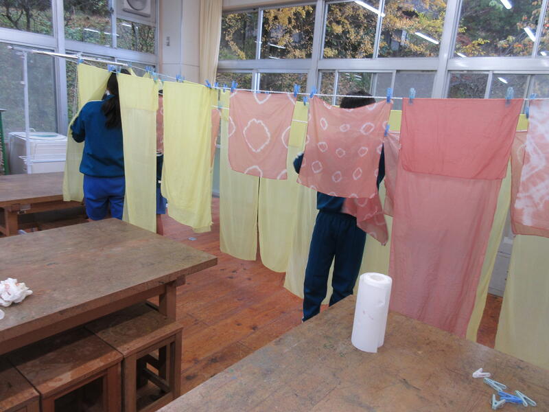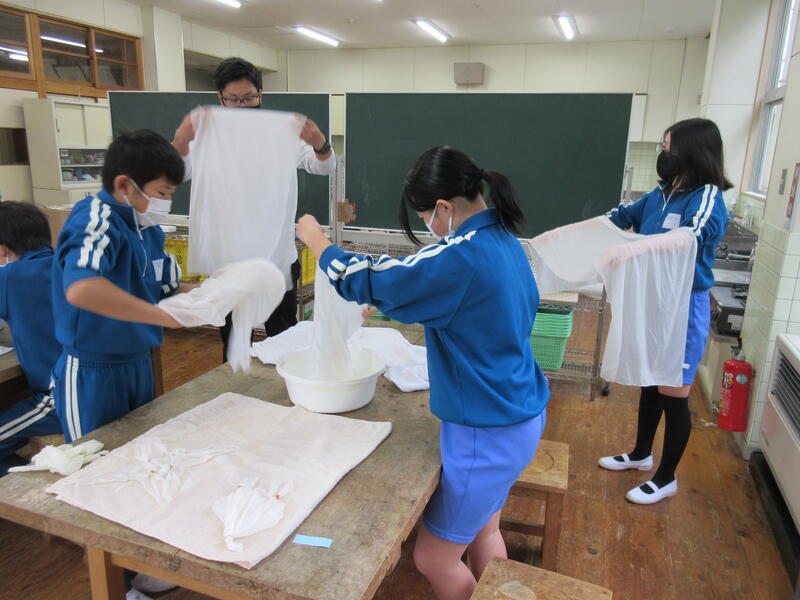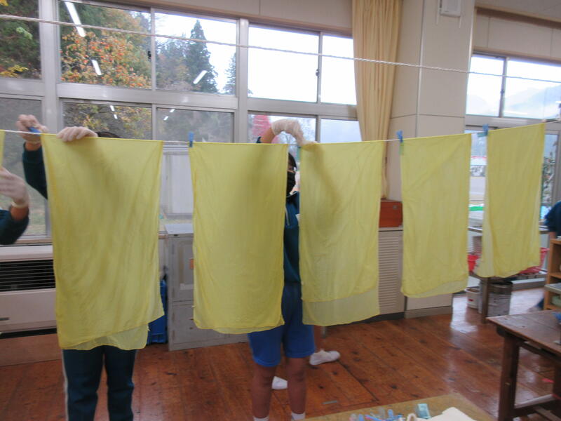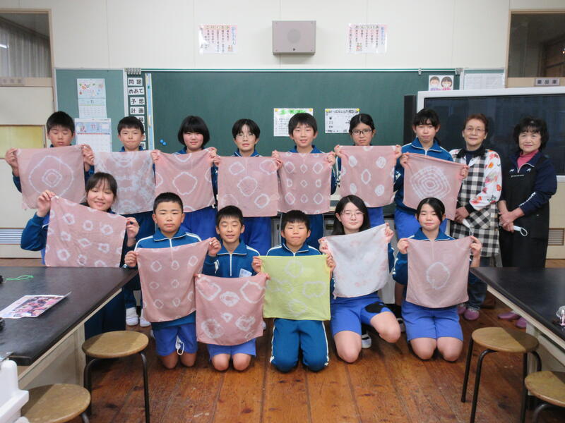 6年生が、吉田キクさん、鈴木智子さんのお二方を講師に招き、ダリア染めを行いました。子どもたちは、シルクの布がどんな風に染色されるのか、活動前からとてもわくわくしていた様子でした。実際に染めてみると、輪ゴムでとめていた部分が白くなり、様々な模様が浮かび上がりました。自分たちが大切に育てたダリアで作った染色液で色鮮やかに染まったハンカチを見て、とても嬉しそうでした。これからは、今日の体験を生かして、ダリア学習のまとめに取り組んでいきます。