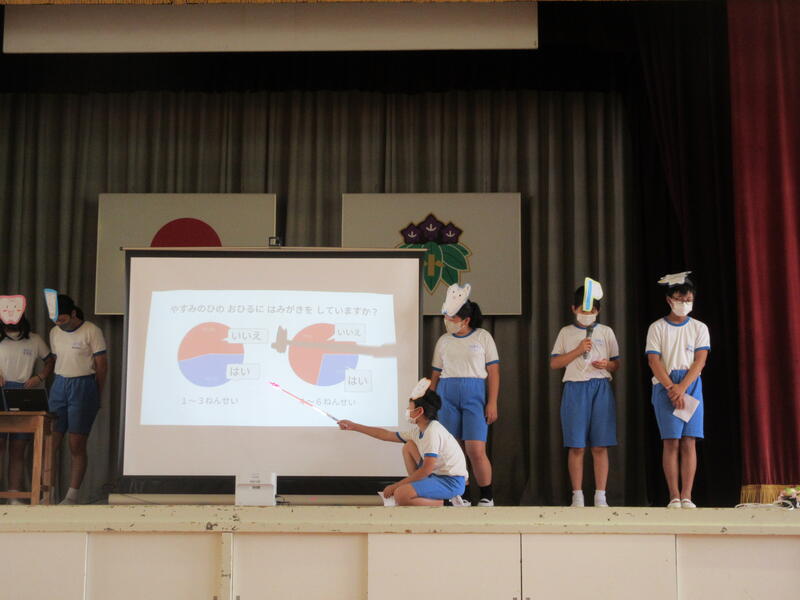 今日は保健給食委員会が企画した、歯についての集会がありました。始めに、アンケートの結果を発表し、次に全8問の〇×クイズを行いました。〇×クイズで最後まで残った6人には、手作りのメダルが授与されました。