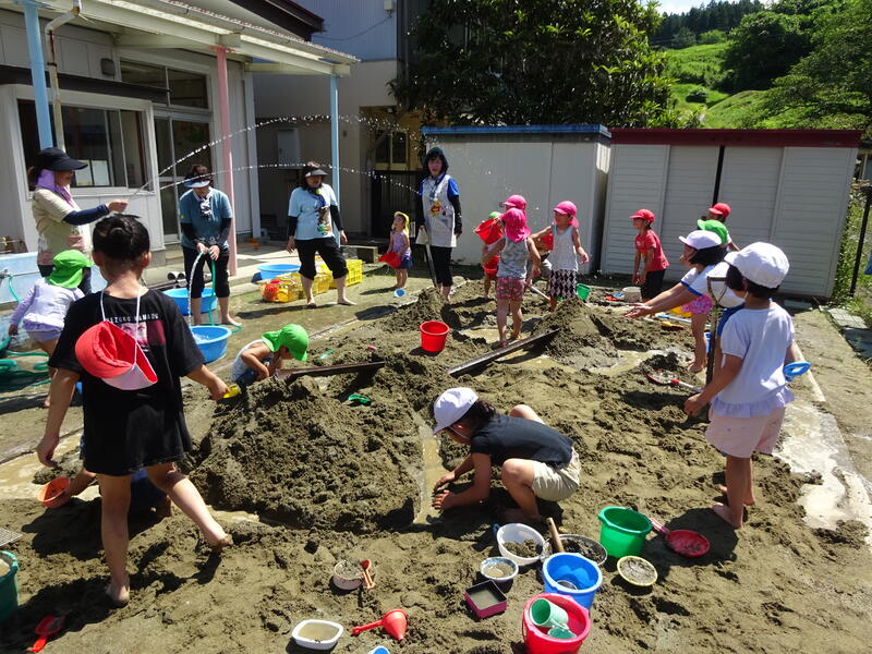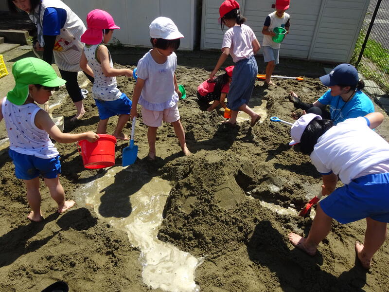 幼稚園にある大きなスコップ、バケツ、雨どい、カップなどの様々な道具を使って、「温泉」「大きな山」「トンネル」などを作りました。砂場の中の水路をつなげたり、土をたくさん掘って山を高くしたり、工夫して活動しました。
