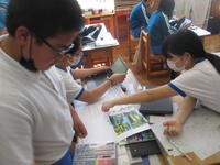 6年生の社会で、室町時代の衣食住について、教科書、資料集、インターネットなどを活用して調べています。