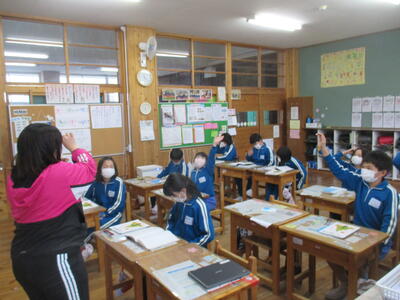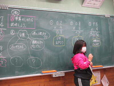 まず、昨日学習した3.7×4のような小数×1桁の整数のひっ算のひっ算の復習をしました。先生が問題を出すと、「小数のかけ算のひっ算も整数と同じように計算する」と学習した子どもたちは、しっかりと解くことができました。ただ、答えに小数点を打つことを忘れてしまうことがあったので、気を付けるように声をかけました。