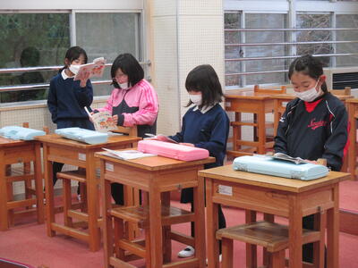 そして、卒業式の式歌の「蛍の光」の練習しました。1年生は初めての曲で歌詞も難しいところもありますが、曲をよく聞いて範唱に合わせて歌いました。